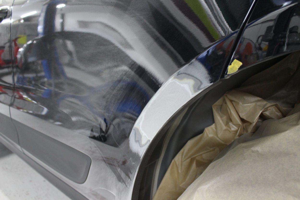 事故状況(依頼内容):自損で、左リヤドアからリヤバンパーにかけて損傷。左フロントドアの凹みも一緒に修理。